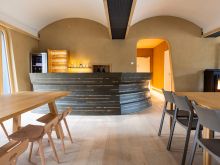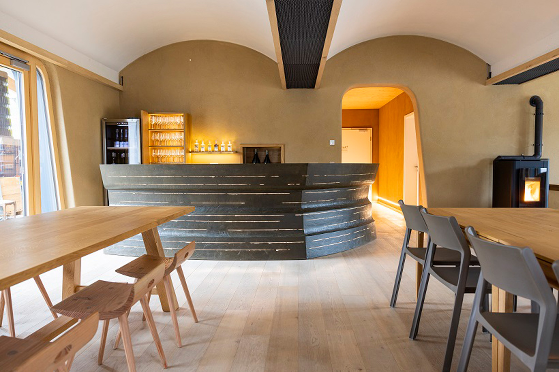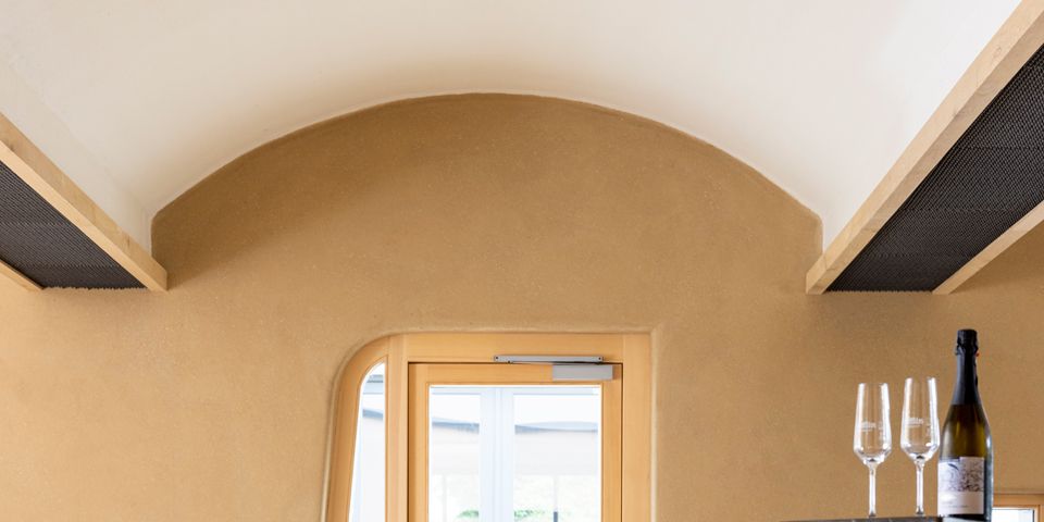 Überaus gelungen ist auch der Neubau der Vinothek. Wir lieferten auch dazu ZiegelGewölbeElemente zum Bau des sogenannten preussischen Kappengewölbes. Mit beschwingter Leichtigkeit überspannt der Gewölbebau den 70 m² großen Raum. Gemeinsam mit den asymmetrischen Fenster- und Türlaibungen und dem Lehmputz wirkt die Architektur bereits auf ganz eigenständige Weise überaus ästhetisch und geschmackvoll.