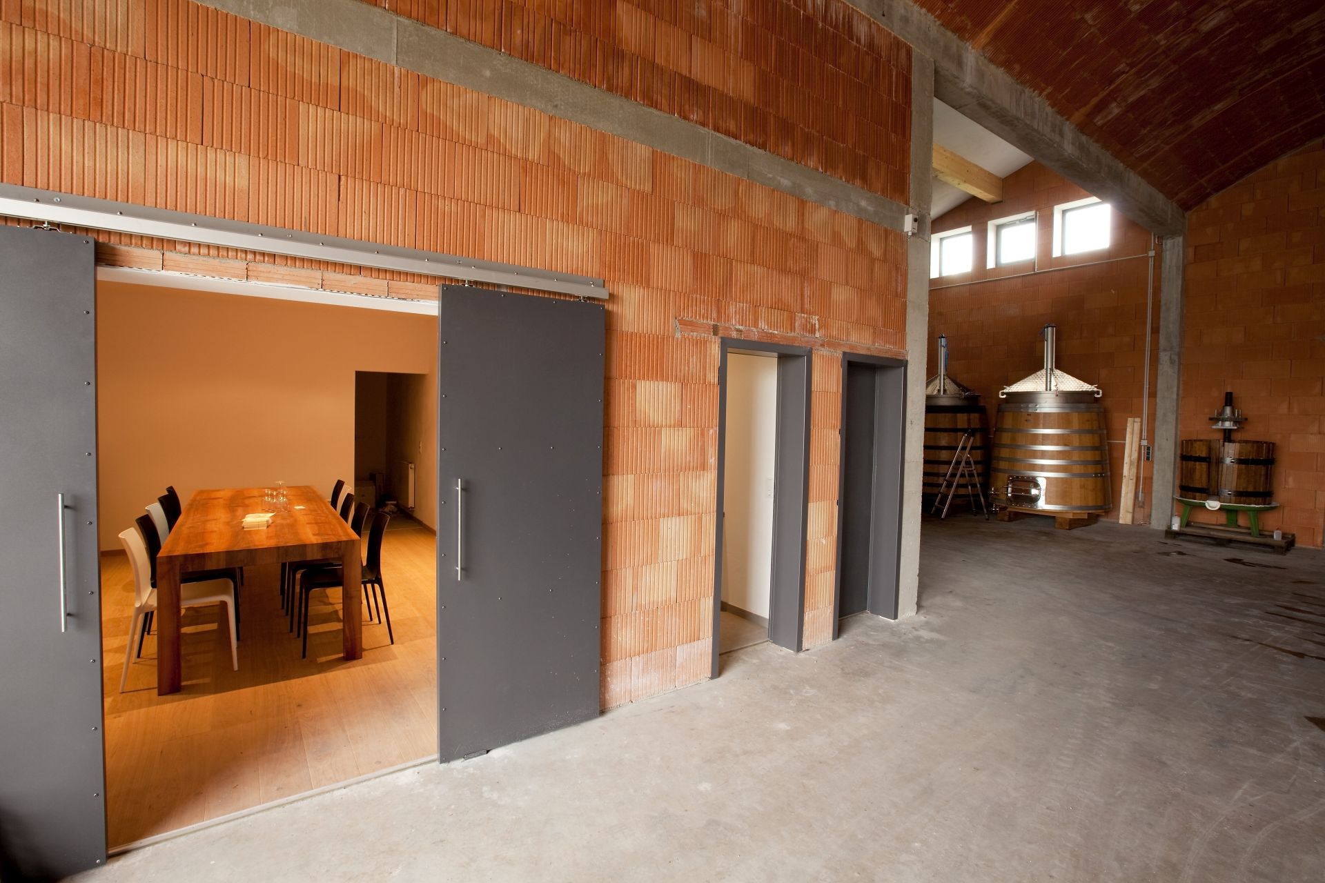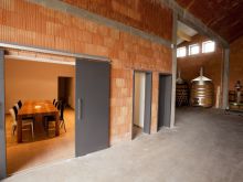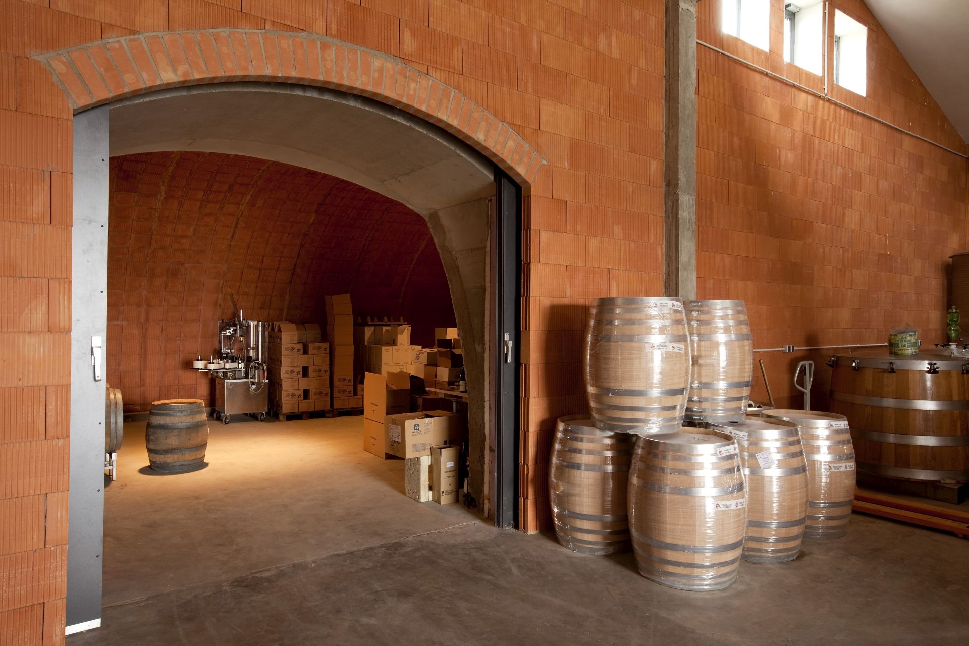 Der Naturbaustoff Ziegel ist im Innern unverputzt roh belassen, um das Klima bauphysikalisch bestmöglich zu unterstützen. Ein stattliches Kappengewölbe überspannt den zentralen Hallenbereich und verbindet die Arbeitsräume mit dem Barriquekeller. Für diesen ist in Fortführung des Hallengewölbes rückwärtig quer ein Tonnengewölbe angebaut worden und von einem Erdhügel überdeckt. Die Erdmasse in Verbindung mit dem Ziegel verfügt über eine enorme Speichermasse zugunsten eines hervorragend trägen Klimas mit der für Ziegelgewölbe typisch gleichmäßig feucht-frischen Luft. „Das Klima ist selbst bei viel Betrieb sehr träge", lobt Hans-Bert Espe seinen neuen Keller, der eigentlich gar keiner ist, da ebenerdig angeschlossen. Kurze Wege erleichtern das Arbeiten ungemein und schonen auch den Wein. Der Pinot Noir und weitere Sorten werden ausschließlich über Schwerkraft filtriert, um Aromen weitestgehend zu erhalten. Die konsequente Ausrichtung auf Qualität lohnt sich: Espes Weine sind auch in den