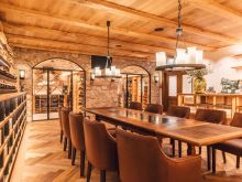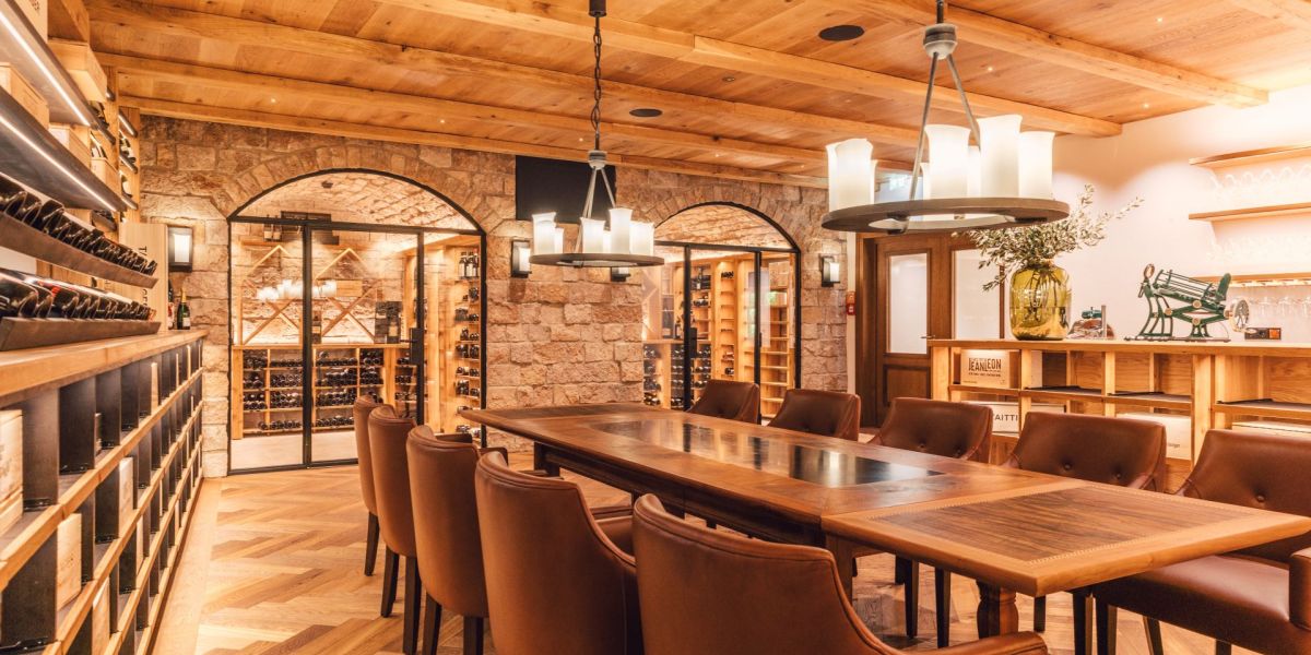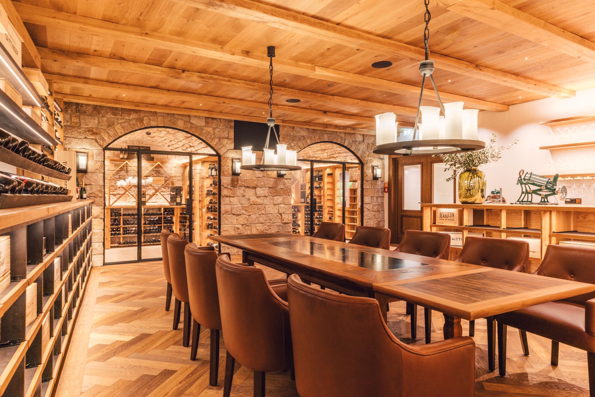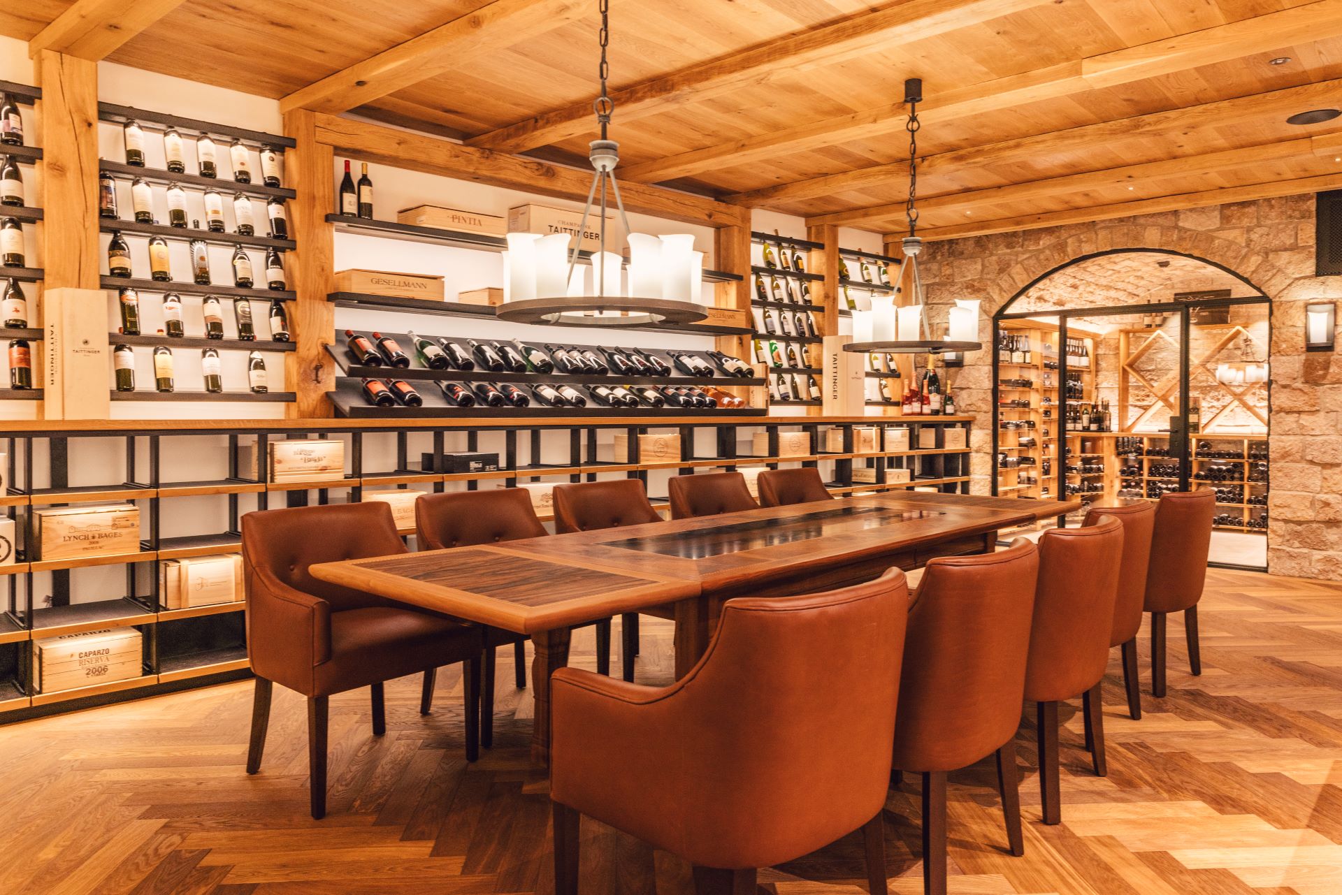 Wir sind stolz, daß wir mit dem Weinkellerbau zu diesem besonderen Projekt beitragen durften. Von Anfang an stand fest: Herzstück des Weinkellers müssen handgemauerte Gewölbe sein, natürlich ortstypisch für die Bergregion aus Felsgestein. Eines für das Rotweinlager, eines für Weißweine, jeweils mit weingerechtem und sortenspezifischem Weinlagerklima. Im angrenzenden Weinrefugium finden Degustationen am Eichentisch für bis zu 14 Personen statt. Die hochkarätig bestückten Weinschatzkammern sind nur durch zierliche Glasfronten vom Weinrefugium getrennt, um ungehindert ihr Flair zu versprühen und durch die für Weinkeller typische Attraktivität punkten zu können. Die hauptsächlichen Materialien Eiche und Granit, die alleine durch ihre charakteristischen Beschaffenheiten den Raum schon ohne viel weitere Staffage einzurichten vermögen, tragen das ihre zum niveauvollen Stil bei.