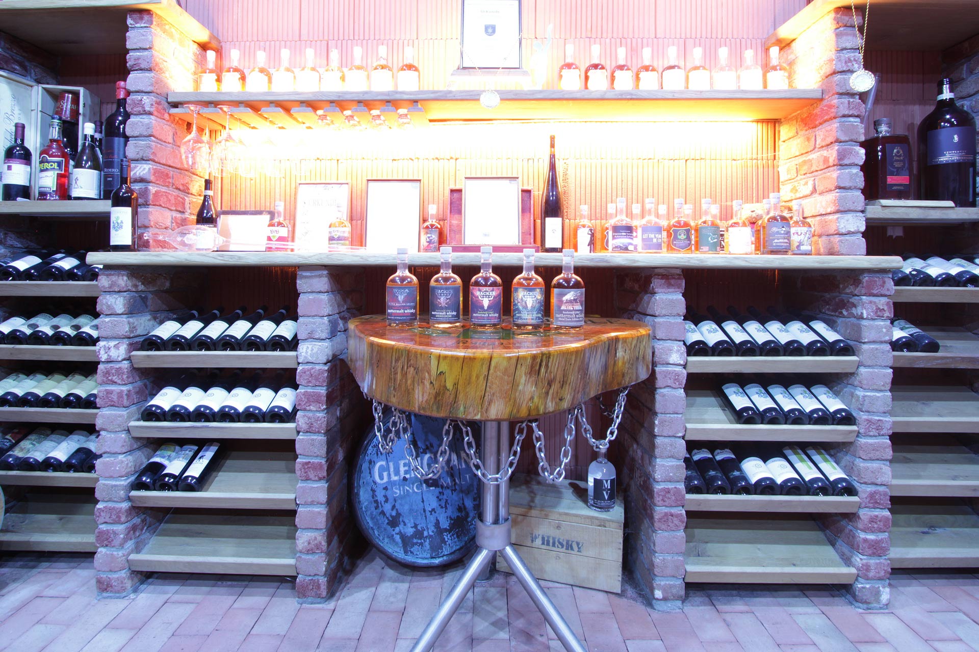 WhiskyRegal handgemauert mit teilweise geneigten Regalböden in Eiche